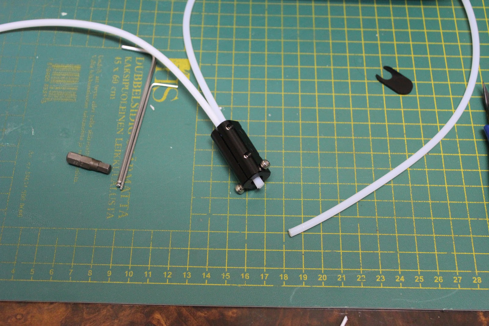線料測試時,發現鐵氟龍管接錯了,要突出3mm,又沒注意到,難怪不好鎖,現在又不出料,這突出也不能太突出,也不能修剪,否則這個頭會被頂住而鎖不平、鎖不緊。 |